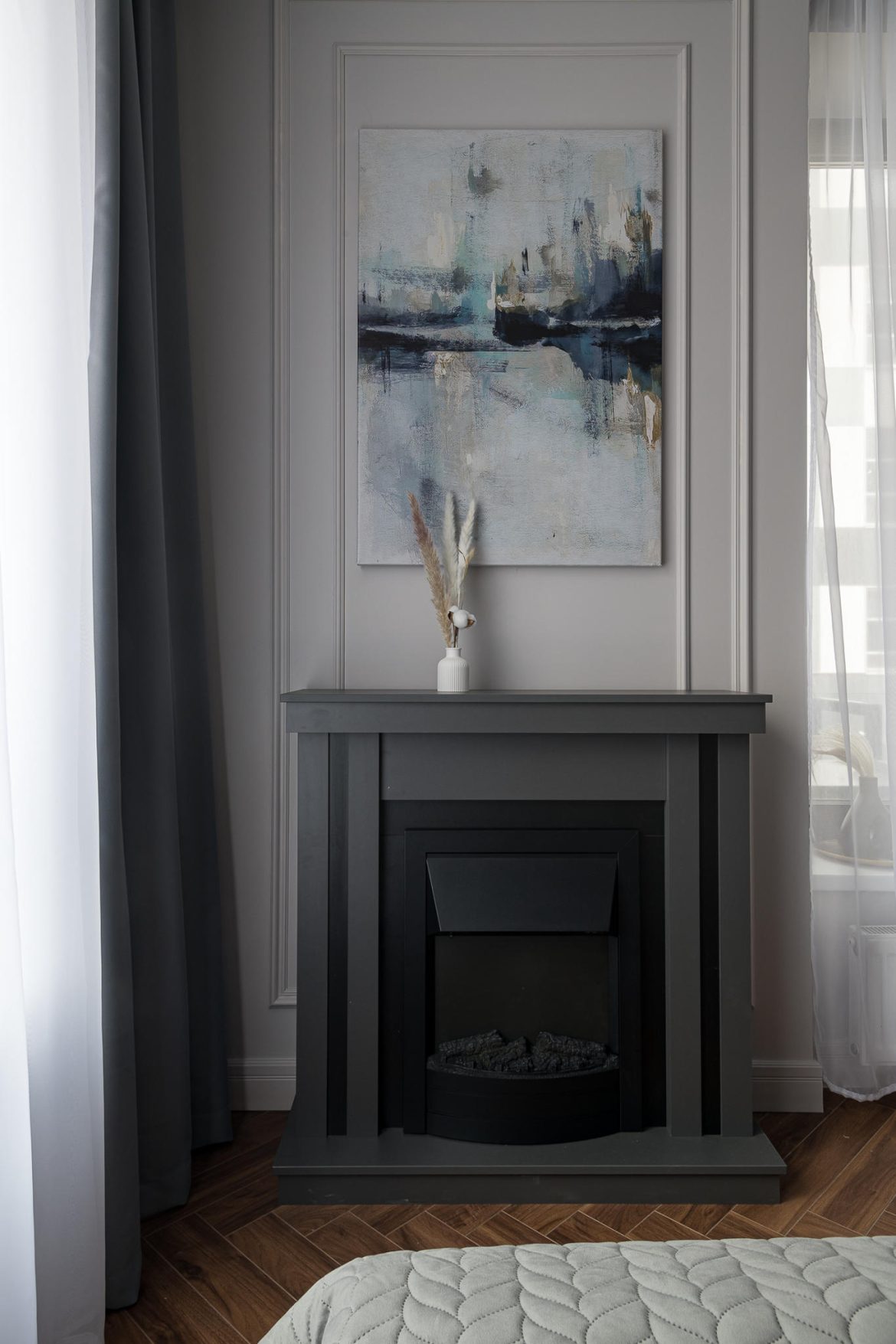 The focal point of the apartment is the electric fireplace opposite the bed. It sets the tone: it can crackle, change the color of the flame, warm, or simply set the mood. It transforms the bedroom into a sanctuary, the perfect urban retreat—especially when you’re lying in bed, gazing at the flames and hearing the wind rustle the curtains by the open window.